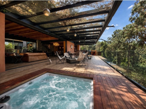 Cuenta con una terraza equipada con jacuzzi, asador y fogatero, perfecta para disfrutar de vistas hacia la copa de los árboles en un ambiente relajado. La propiedad se entrega completamente amueblada y lista para habitarse o como inversión de alto perfil para generar ingresos de forma rápida, además de contar con iluminación indirecta que realza su arquitectura y crea una atmósfera espectacular durante la noche.